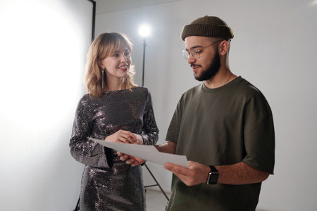 Waist up portrait of young production director talking to smiling actress backstage and holding notes in studio copy space