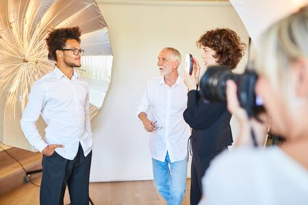 backstage photography. teamwork ideas discussion brainstorming. creative process. art workspace. photographer and assistant reviewing photos on camera