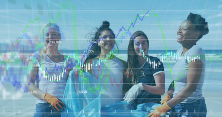 Holding blue bag, four volunteers in jeans picking debris on shoreline with gloves, overlaid charts. Environmentalism, teamwork, sustainability, community, activism, outdoors, nature