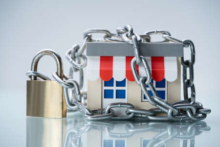 Close sign and chain hangs on a glass storefront or door due to the shop or retail business being closed during the pandemic outbreak