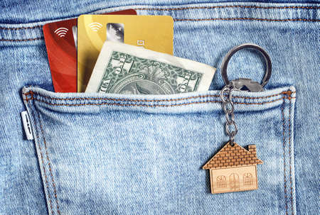 a credit card, house keys and a paper bill are in the pocket of jeans. space for text.