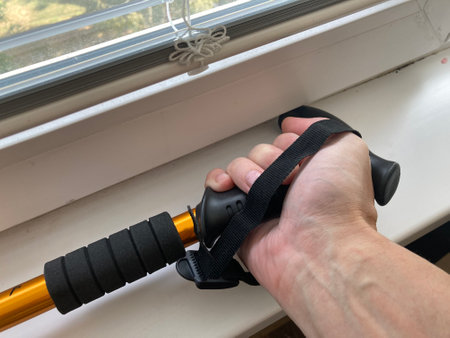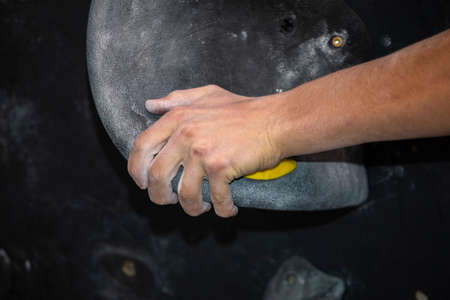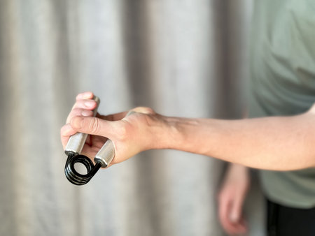 Man strengthens his grip using hand black rubber expander. He is seen holding expander with firm grip, suggesting focused exercise. Close up.