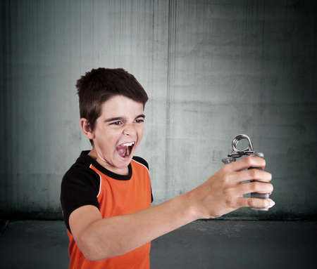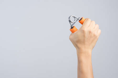 Southeast asian, Chinese young man’s right hand gripping hand exercise gripper.