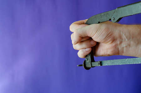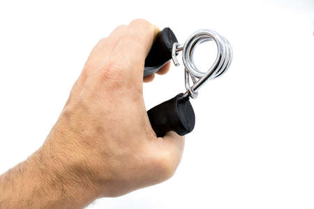Male hand holds an expander. Expander in a male hand. Banner with space for text.