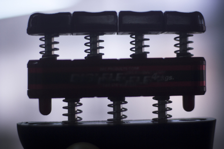 Hand gripping a hand strenghener under tension. Metaphor for stress or pressure