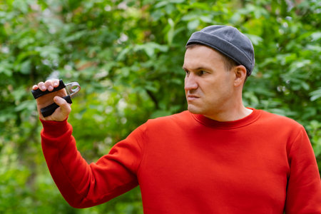A man strengthens his grip using a hand expander in an outdoor forest setting. He is seen holding the expander with a firm grip, suggesting a focused exercise routine