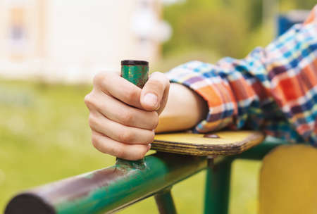 Close up of child hand holding handle of children's sports equipment on playground. Concept of healthy lifestyle from young age
