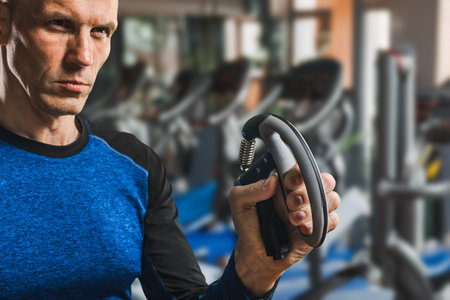 Portrait of serious strong sporty man training in gym with hand gripper. Serious athlete performing hand grip training for arm rehabilitation indoors