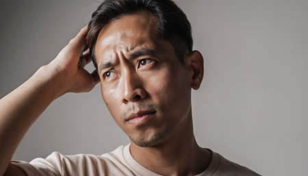 A close-up of an Asian man with a furrowed brow, looking thoughtful and perhaps a bit confused, as he runs his hand through his hair.
