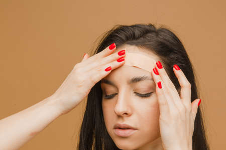 Close up beautiful girl with patch on face, young and fit body posing in underwear. Sport, fitness, diet, nutrition and health care concept