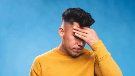 Exhausted, sick young guy with migraine symptom touching forehead, feeling headache and standing isolated on blue copy space background in white t-shirt. Concept of sickness