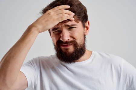 bearded man holding his head pain stress emotions light background
