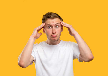 Frustrated man portrait. Panic attack. Stressed out guy touching head isolated on orange background.