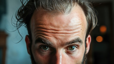 eyes of a young man, his furrowed brows betraying his worry about hair loss. Amidst indoor settings