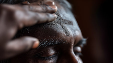 Ash cross on forehead, religious blessing, outdoor setting