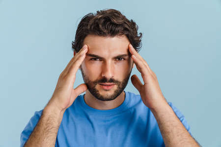 Young brunette man with headache rubbing his temples isolated over blue background