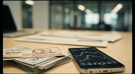 A stack of US dollar bills and a smartphone displaying a stock chart on a modern office table with blurred background.
