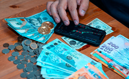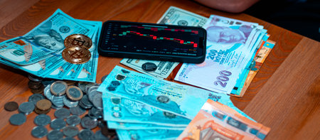 Multi Euro Dollar cash and coin, Different type of new generation banknotes, bitcoin, turkish lira