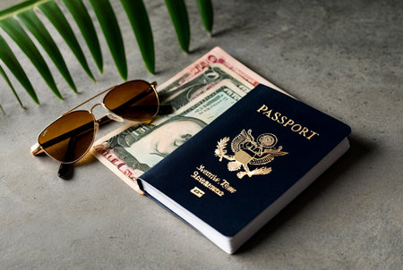 Close-up of passport, currency, sunglasses, smartphone, and palm leaf on desk, suggesting preparation for a journey. Travel essentials on textured surface. Travel vacation concept. Copy ad text space
