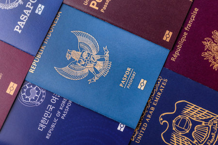 A background of several passports from different countries, an international ID card. Passports from different countries as a background for your design