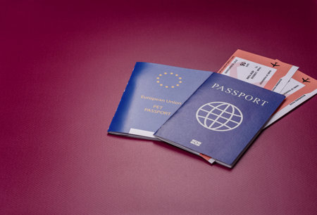 Banner with two abstract global passports on grey background. Joint vacation, travel together concept. Identity, nationality verification. Copy space. High quality photo