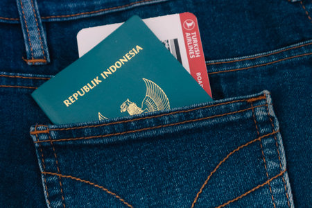 Indonesia in July 2022. An Indonesian passport and a Turkish Airlines boarding pass in a jeans pocket. This photo is suitable as an illustration of traveling abroad.