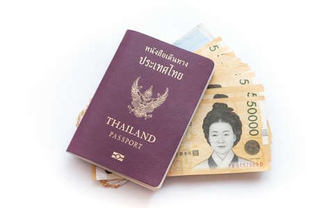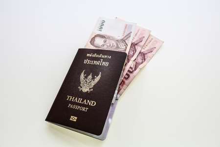 Thai passport and money on white background