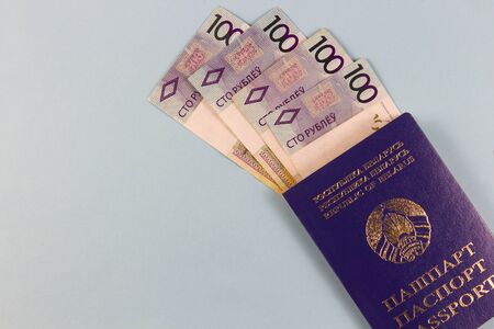 Belarusian passport and new banknotes in the Republic of Belarus with a face value of one hundred rubles. Separately on a blue background.