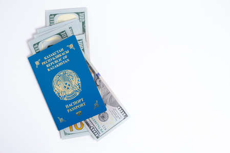 Passport citizen Republic of Kazakhstan blue with coat arms and pack hundred-dollar bills inside, on white background