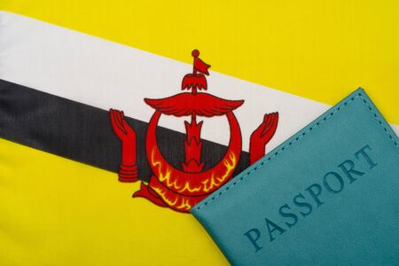 On the background of the flag of Brunei Darussalam is a passport. The concept of travel and tourism.
