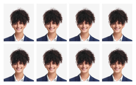 Passport photo, collage. Man on white background, set of photos