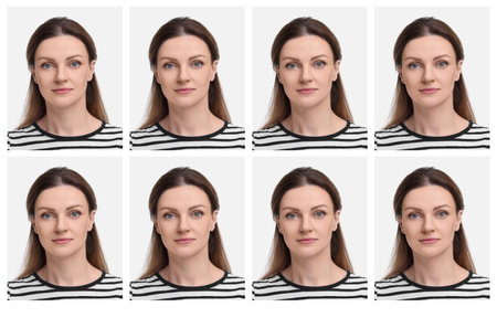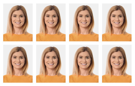 Passport photo, collage. Woman on white background, set of photos