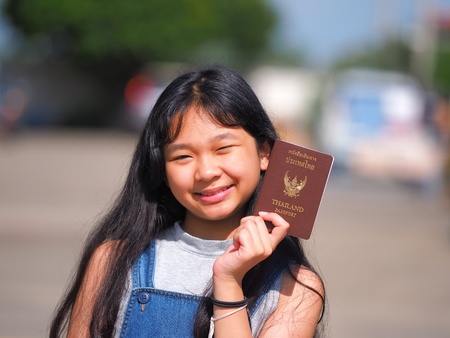 Asian teen girl with long black hair holding Thai passport and smiling with blur background