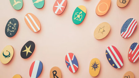 A creative arrangement of colorful wooden coins featuring diverse national flags, symbolizing culture and identity in a visually appealing layout. Perfect for travel and heritage themes.