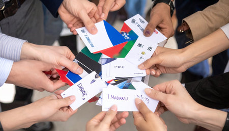 A diverse group of people come together, holding up their passports and national flags in a display of global unity and collaboration.