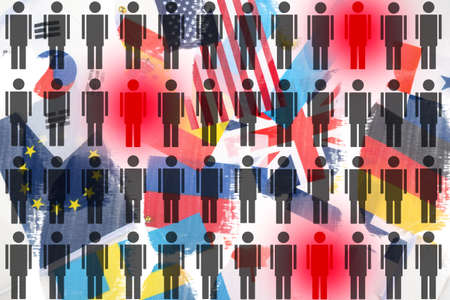 Unemployed people in world. Silhouettes of people next to flags. Mass unemployment. Flags of different countries as symbol global problem. Dismissal of people all over world. Staff cuts due to crisis