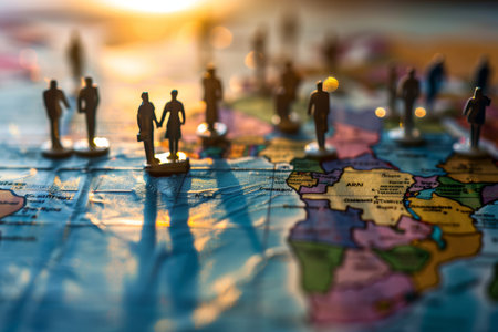 Small human figures navigate a detailed map of a nation, representing the intricacies of strategy and power planning in modern governance.