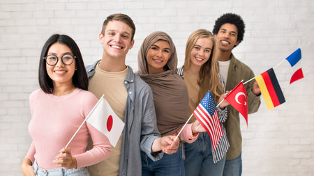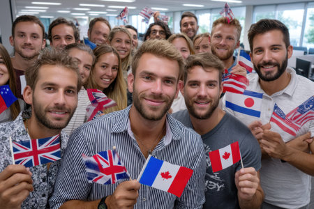 People from different nationalities gather in an office, holding flags of their countries and smiling joyfully.