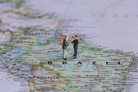Selective focus of miniature businessman handshake and Brazil map background as commitment, agreement and travel Concept