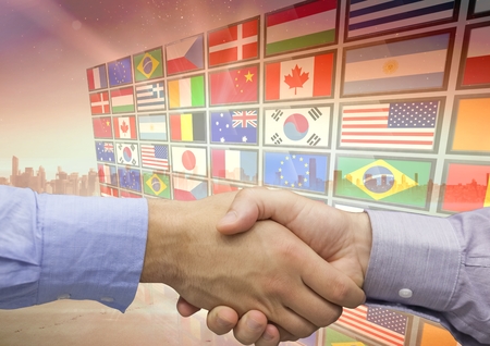 Closeup of Two Businessmen Shaking Hands in Front of Flags Symbolizing International Partnership.