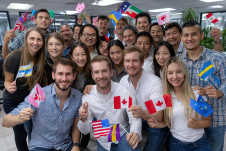People from various backgrounds gather in a modern office, holding flags and celebrating together with smiles.
