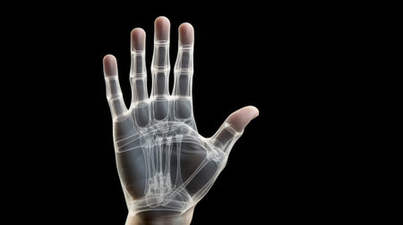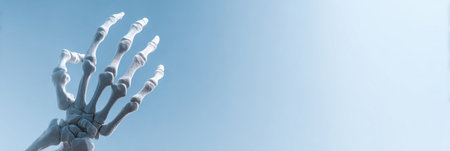 A close-up representation of a human hand skeleton highlights the intricacies of the phalanges and metacarpals