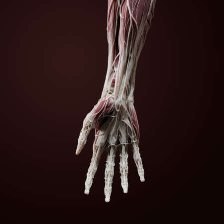 Detailed 3D model of a man's forearm muscles showing complexity and strength in the anatomical region. Concept Anatomy, Forearm Muscles, Strength, 3D Model, Detailed