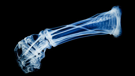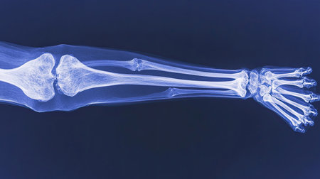 X-ray image of a human forearm displaying detailed bone structure, including radius and ulna. Concept of medical imaging, bone anatomy, orthopedic analysis, and healthcare diagnostics.