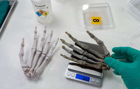 Forensic scientist weighs right hand of human skeleton on a scale to investigate murder and take samples at crime lab, conceptual image