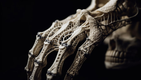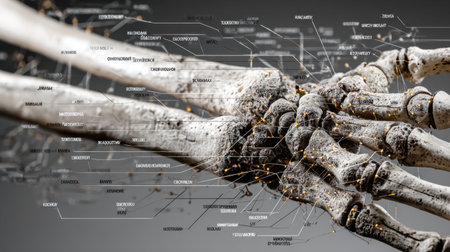 Explore the intricate details of a human hand skeleton captured in a close-up view, showcasing bones and joints with annotations for educational and research purposes.
