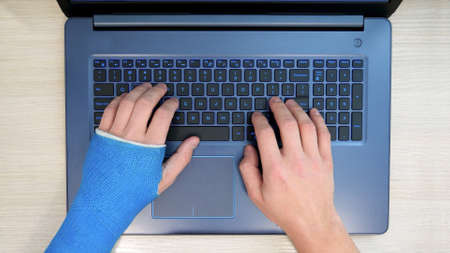 Top view of hands typing on a laptop computer on a keyboard, one hand wrapped in fiberglass plaster cast. A freelancer with one broken wrist works the Internet at home