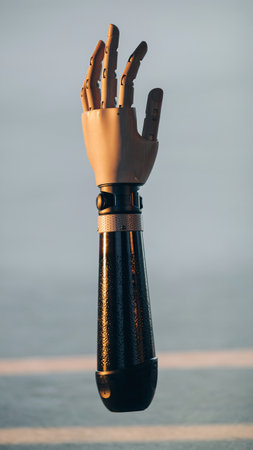 Injured person with bionic prosthesis joins hands with woman