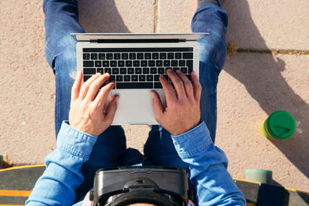 Man sitting on a longboard with laptop and VR glasses in the park, top view