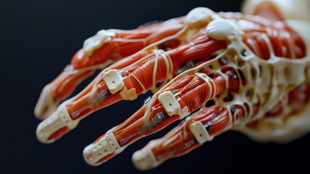 Anatomical model of a clenched fist showing the network of muscles in the hand and forearm on dark background